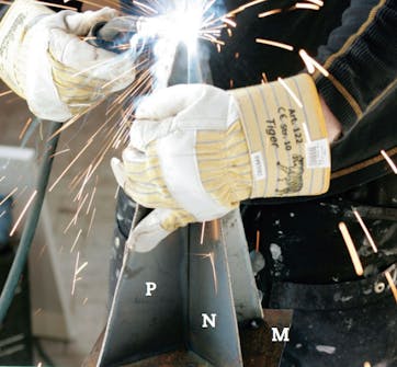 Sätt spetsarna (N) och (P) på fotplattan (M). Svetsa först fast den större trekanten och därefter de två mindre. De skall fungera som spjutspetsar när fotplattan placeras vid elden.