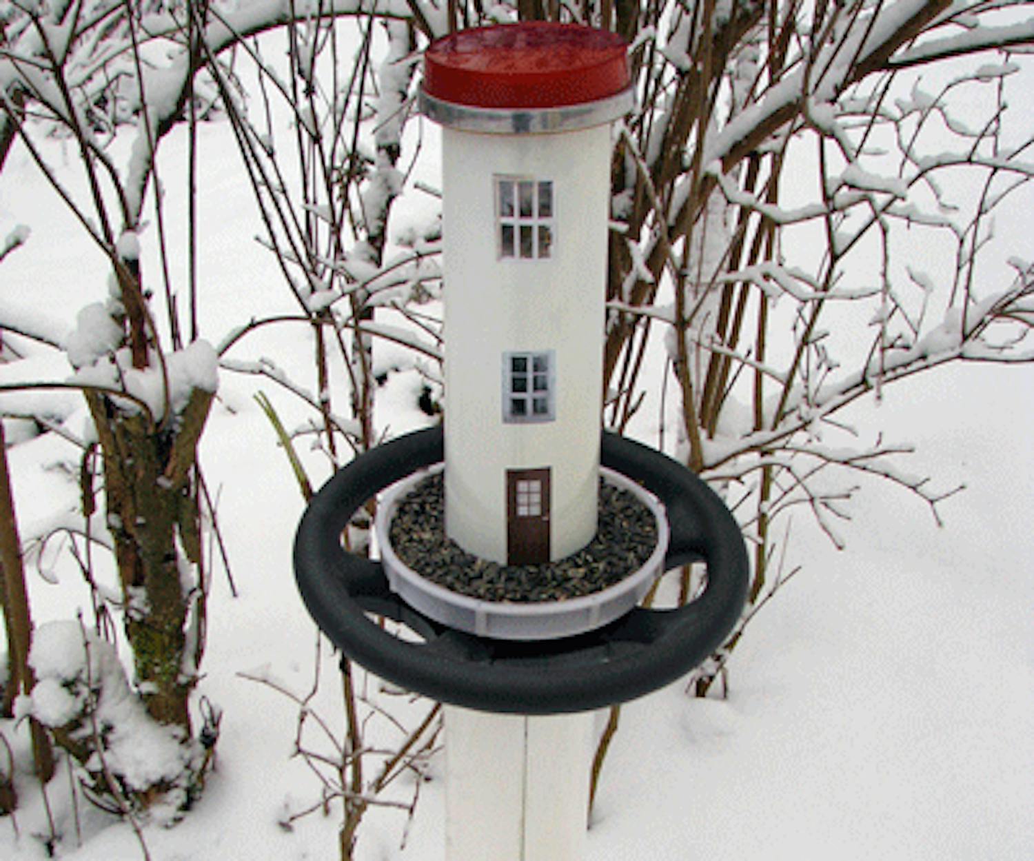 Foderautomaten är en festlig fyr. Taket lyfts av när fyren ska fyllas med frön, som matas fram automatiskt nertill.