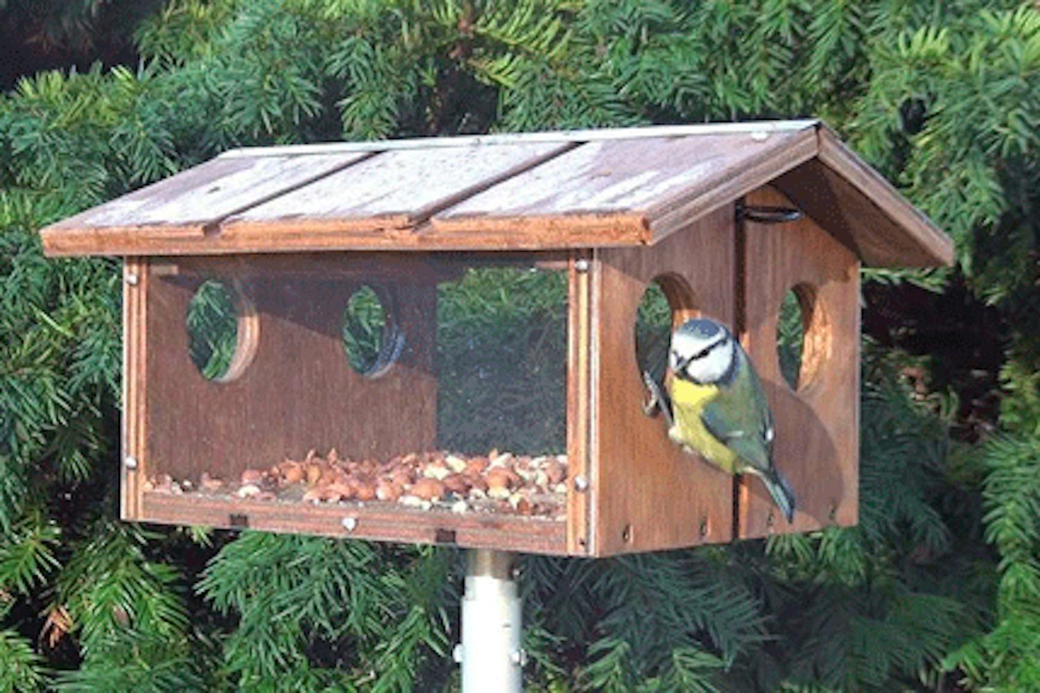 Många har tänkt på småfåglarna när fågelborden har tillverkats. Det har också Lasse gjort när han snickrade ett med sidor av plexiglas och satte på en stolpe. Även hans andra bord, som har placerats utanför ett fönster, är gjort för småfåglarna.