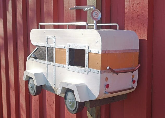Jag har snickrat en lite annorlunda holk åt sommarens campinggäster, skriver Jan. Och det ger vi honom rätt i! Holken är verkligen annorlunda men bjuder på fina detaljer och är ett bevis på skön humor. Tack för ditt härliga bidrag och grattis till gräsklipparen, som förhoppningsvis inte skrämmer bort campinggästerna i holken.
