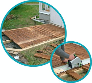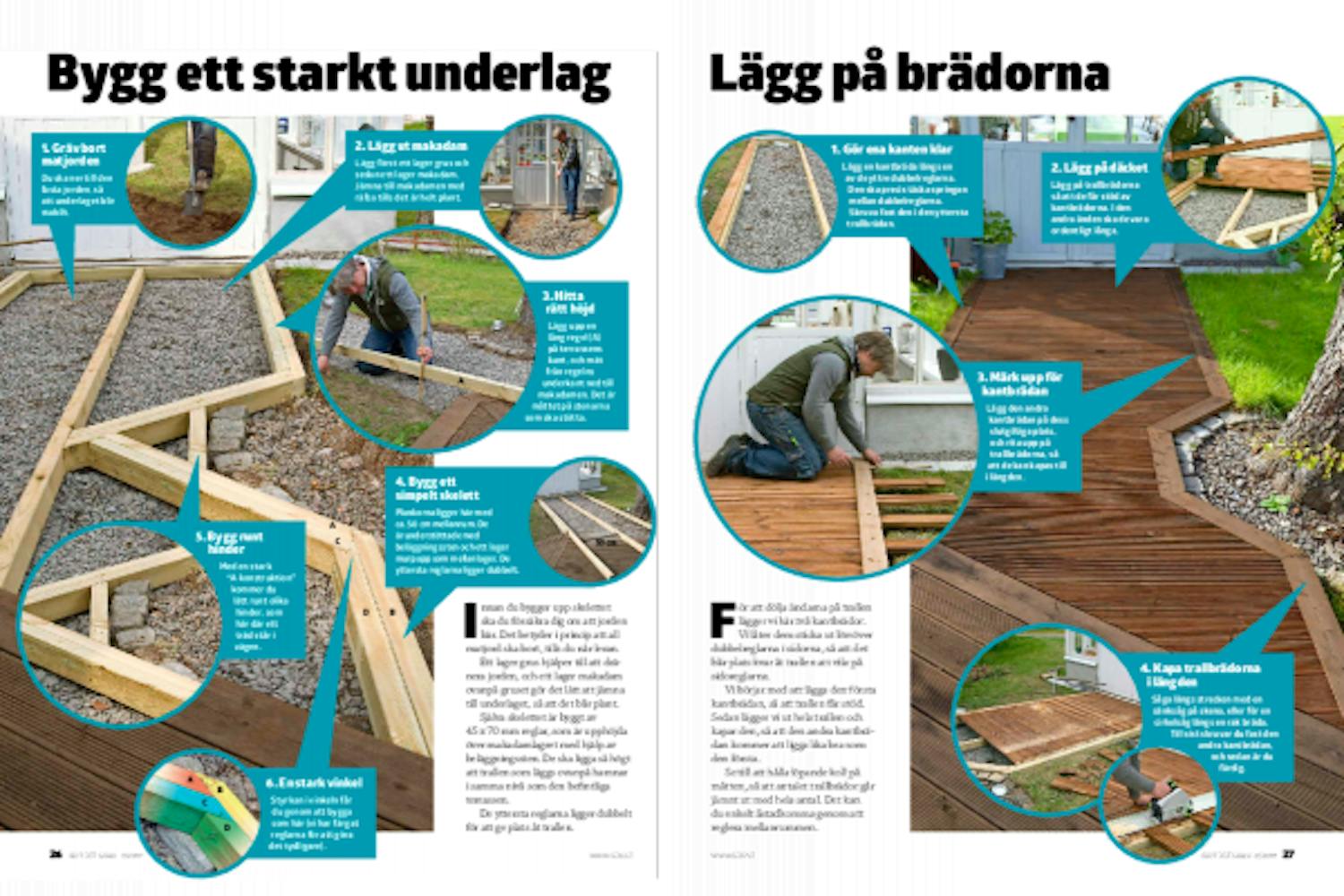 Lägg på däcket Lägg på trallbrädorna så att de får stöd av kantbrädorna. I den andra änden ska de vara ordentligt långa.