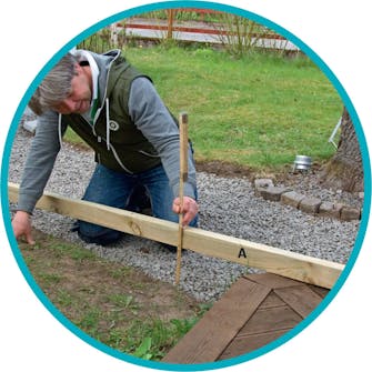 Hitta rätt höjd Lägg upp en lång regel (A) på terrassens kant, och mät från regelns underkant ned till makadamen. Det är måttet på stenarna som ska stötta.