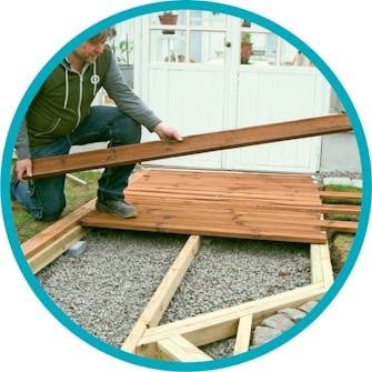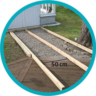 Bygg ett simpelt skelett Plankorna ligger här med ca. 50 cm mellanrum. De är understöttade med beläggningssten och ett lager murpapp som mellanlager. De yttersta reglarna ligger dubbelt.