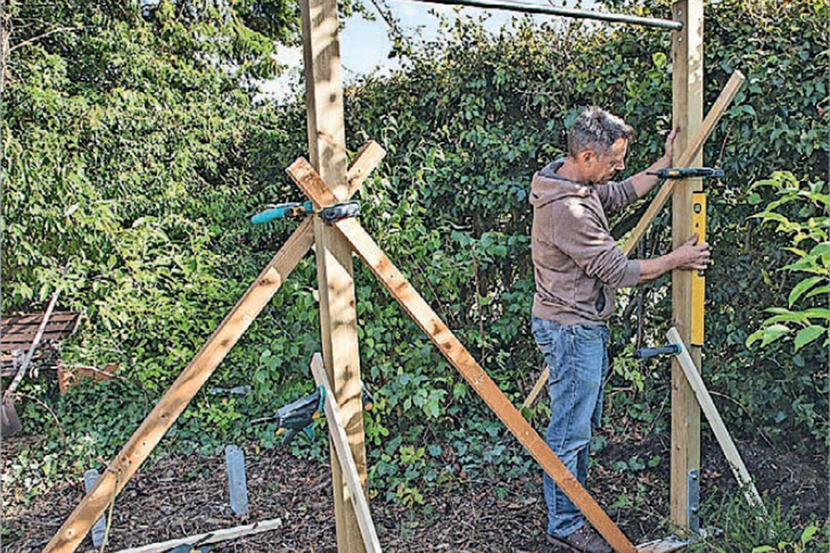 Kolla också så att avståndet mellan stolparna är detsamma uppe och nere efter att du har monterat stången. När stolparna står helt perfekt fixeras de i det här läget, t ex med brädor och reglar som tillfälligt spänns fast som stöttande snedsträvor vid stolparna.