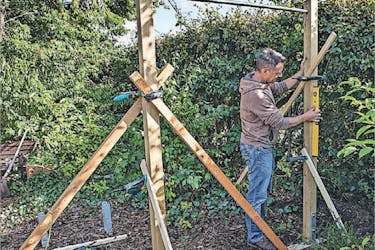 Montera stängerna i de korta stolparna när du är färdig med de höga. Avvakta med att helt skruva fast stolparna vid stolpskorna - då har du fortfarande möjlighet att finjustera lite.