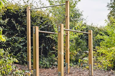 Marken täcks med barkflis runt gymställningen. Det ger ett förhållandevis mjukt underlag om du skulle råka ramla ner från ställningen under träning. Barkflis gör det också svårare för ogräs att växa där.