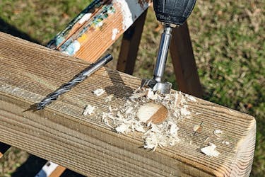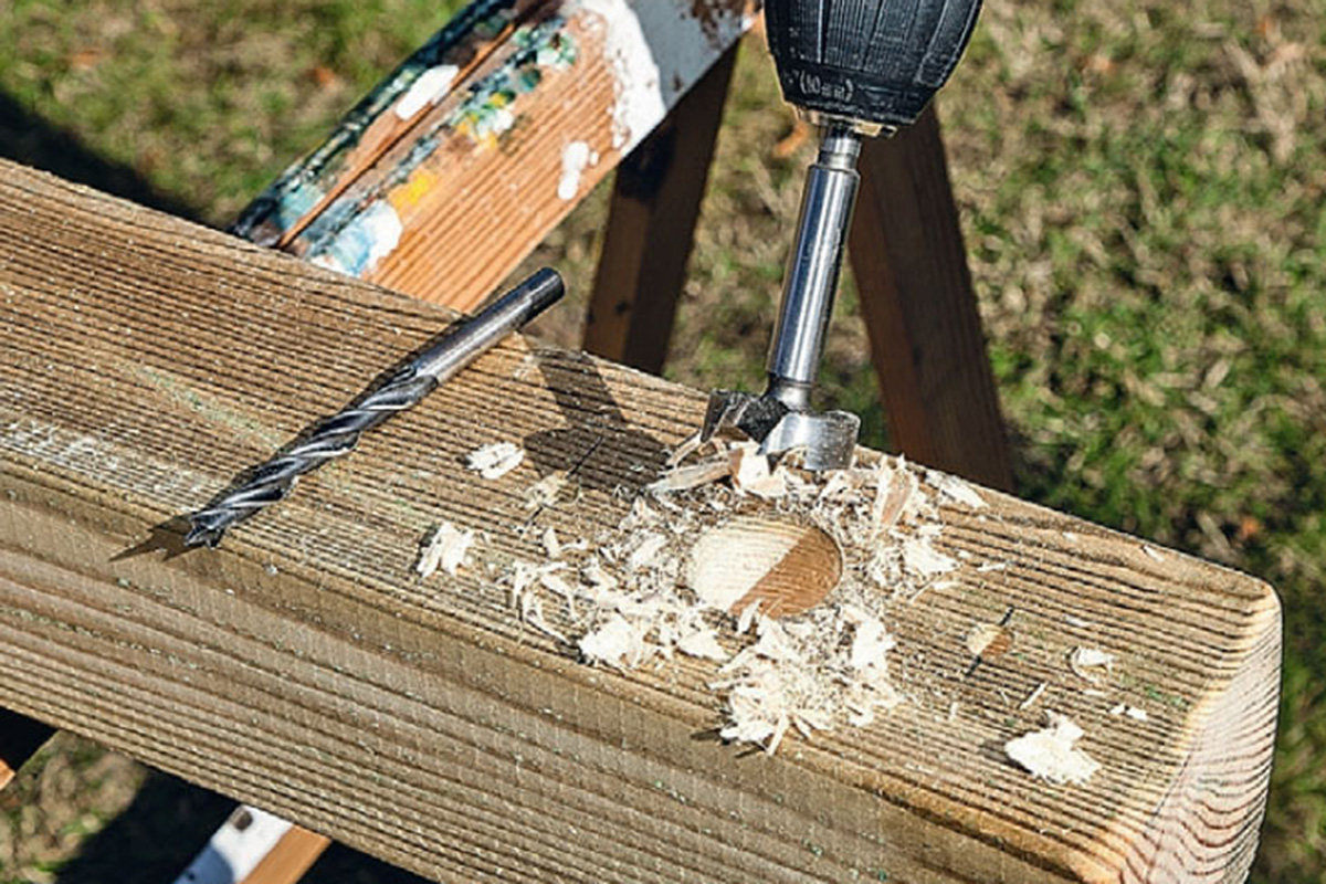 Borra hål till stången med ett 60 mm forstnerborr. I tre av stolparna ska hålet vara genomgående, i två av dem ska hålet vara 60 mm djupt, så att stången kan placeras i ett “stängt” hål på den ena sidan.
