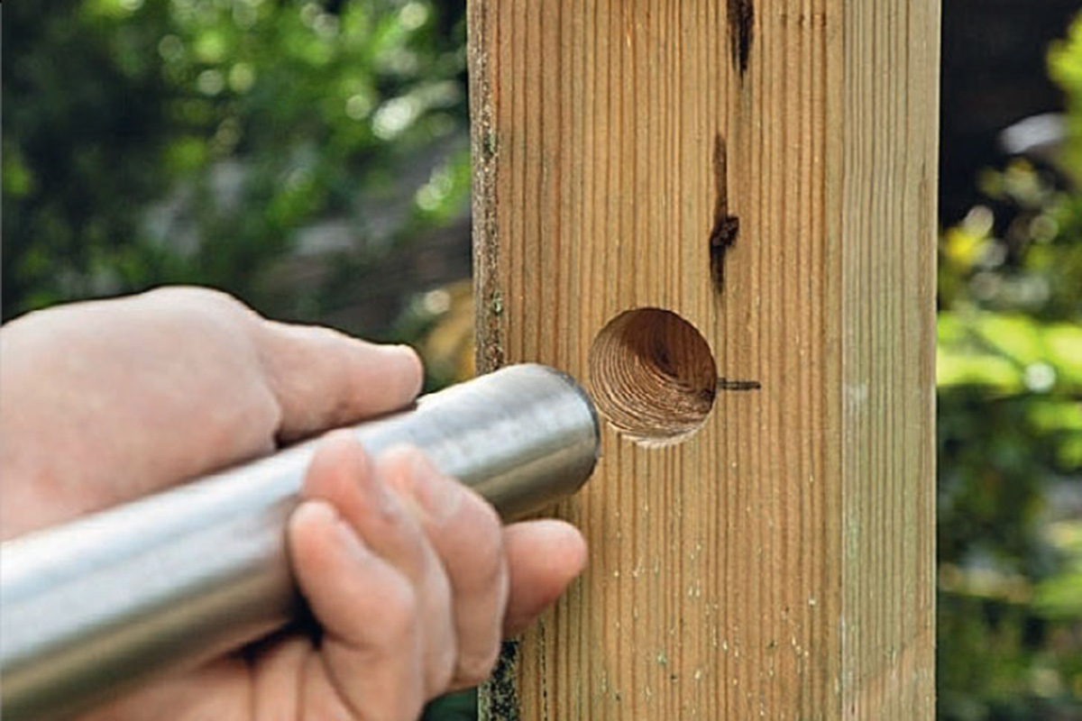 Överst på stolpen ska du borra hål för stängerna av rostfritt stål. I tre av stolparna ska hålen vara genomgående. Då blir det plats så att stången kan sättas på plats i 6 cm djupa hål i den motstående stolpen. De genomgående hålen täpps igen med beslag när stängerna är på plats.