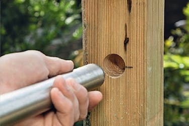 Borra genomgående hål i stolpen med ett 14 mm borr till stolpskon som ska fästas med 10 mm bult. Hålen ska vara lite större än bultarna, då går det lättare att sätta i och fästa dem.