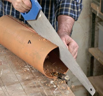 En 50 cm lång bit markrör A av pvc sågas itu på längden med handsåg. Lägg märke till att röret inte delas i två lika stora halvor.