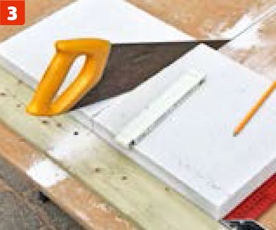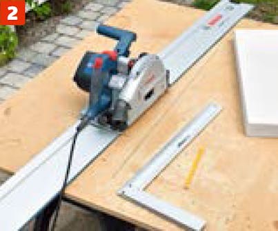 Ta fram en träskiva som arbetsbord. Det är smart att såga ett spår i skivan som du kan använda för att styra sågen. Då blir delarna raka och mycket lättare att sätta ihop. Spåret ska vara lite längre än delarna som sågas till.