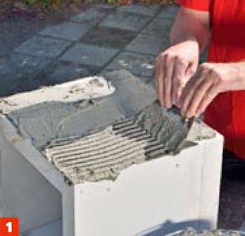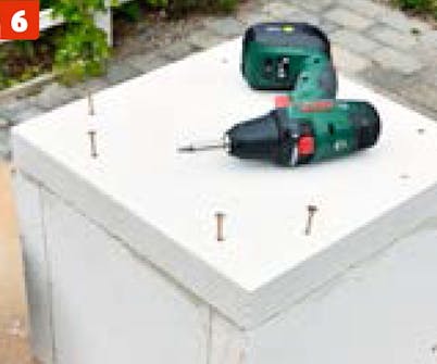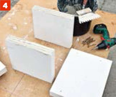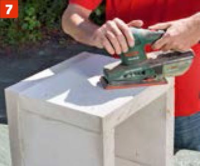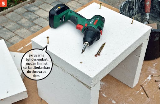 När du sågar till lättbetongsblocken är det viktigt att måtten är exakta och sågspåren raka. Då blir det nämligen lätt att sätta ihop delarna. Du kan göra det lättare för dig om du först sågar ett långt, rakt spår i en träskiva, för då kan spåret styra sågen. När delarna sedan har sågats till ska de limmas. För att sätta delarna i press drar du i några skruvar. Till sist slipas krukan så att ytan blir slät och fin.