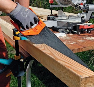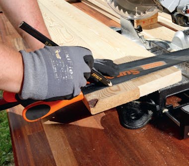 Alla kortändar ska kapas i 90°. Du bör inte lita på att köpta brädor är vinkelrätt kapade, så därför bör du kapa alla brädor vinkelrätt. Det går utmärkt med fogsvans men har du en kap- och geringssåg så går det lättare.