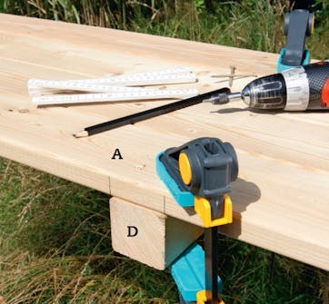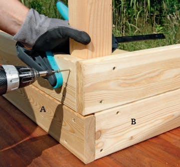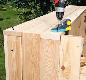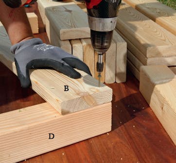 Efter förborrning skruvar du ihop ett av hörnen. Börja uppifrån med den övre kortsidan B. Dra i skruvarna förskjutna från varandra så att de inte kolliderar i träet. Vänd brädorna så att kärnsidan hamnar mot stolparna D.
