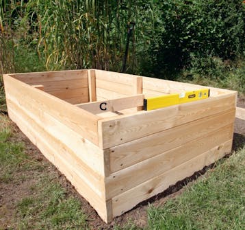 Fäst stolparna D på mitten av långsidebrädorna A när alla fyra varven är klara. Lådan rymmer en hel del jord och trycket på sidorna blir därför stort. För att de inte ska pressas utåt fästs ett tvärstag mellan långsidorna.