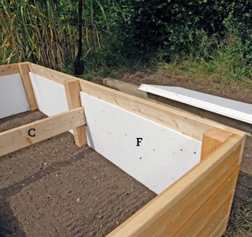 Montera de isolerande skivorna. De ska vara så långa att de kläms fast mellan hörnstolparna. Skivorna F på långsidan ska klämmas fast mellan hörnstolparna och mittstolparna D.
