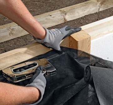 Klä lådan invändigt med fiberduk. Börja i ett hörn och pressa in duken mot stolpen. Fäst den sedan med häftklammer precis ovanför cellplastskivorna, cirka 5 cm under odlingslådans ovankant.