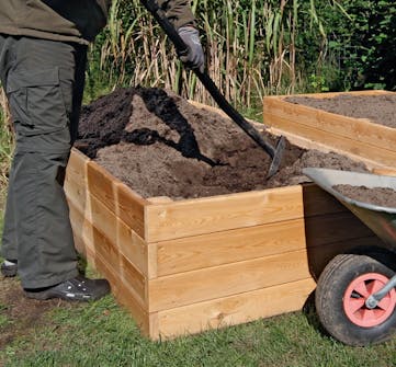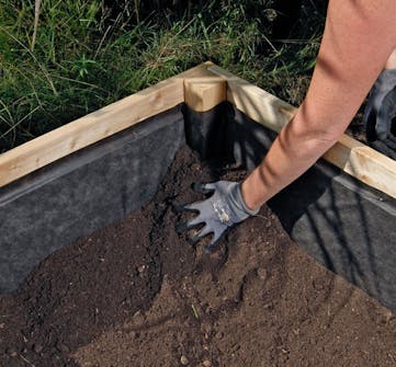 Rätta till fiberduken i varje hörn och fyll på med jord, så att duken pressas ut mot både stolpar och sidor. På så sätt riskerar du inte att duken dras ner när du fyller odlingslådan med jord.