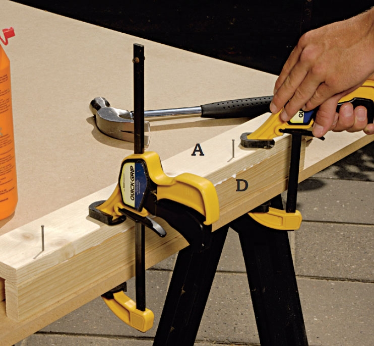 Börja med att sätta ihop benen av listerna (A och D). Stryk lim på kanten av D-listen och ställ en stödlist i samma dimension på högkant vid sidan av.