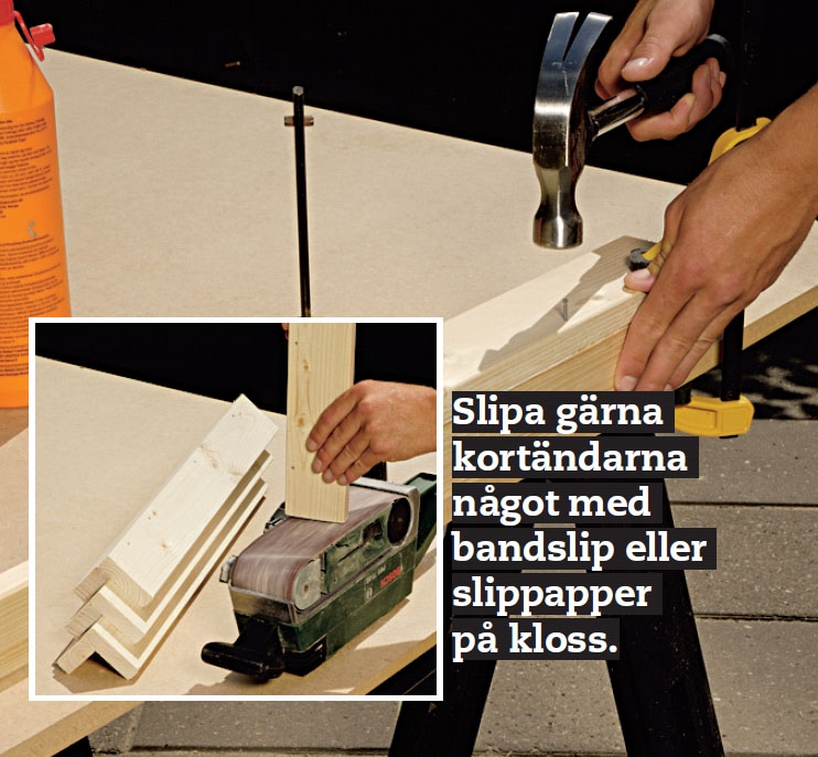 Lägg två av de färdiga benen på arbetsbordet med ett par sidor (B) emellan. Skruva nu fast två lister på bordet på utsidan av var sitt ben. Då får du ett anhåll som du kan använda när de andra sidorna snickras klara.