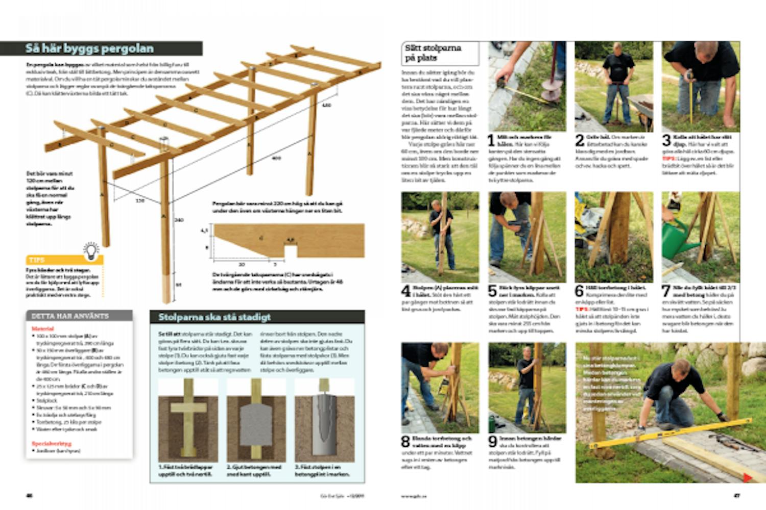 Se till att stolparna står stadigt. Det kan göras på flera sätt. Du kan t.ex. skruva fast fyra tvärbrädor på sidan av varje stolpe (1). Du kan också gjuta fast varje stolpe i betong (2). Tänk på att fasa betongen upptill utåt så att regnvatten rinner bort från stolpen. Den nedre delen av stolpen ska inte gjutas fast. Du kan även gräva ner betongplintar och fästa stolparna med stolpskor (3). Men då behövs snedsträvor upptill mellan stolpe och överliggare.