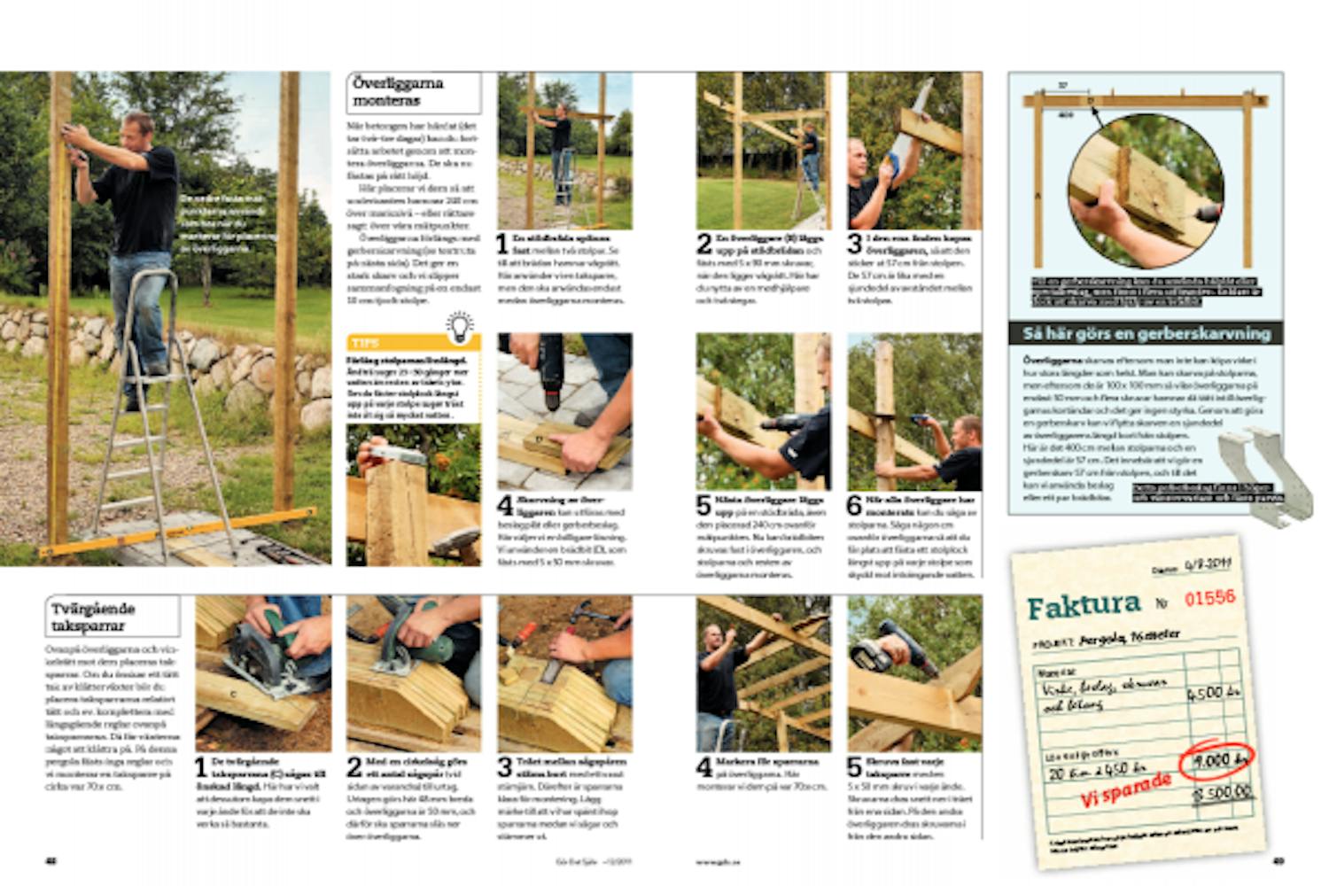 Ovanpå överliggarna och vinkelrätt mot dem placeras taksparrar. Om du önskar ett tätt tak av klätterväxter bör du placera taksparrarna relativt tätt och ev. komplettera med längsgående reglar ovanpå taksparrarna. Då får växterna något att klättra på. På denna pergola fästs inga reglar och vi monterar en taksparre på cirka var 70:e cm.