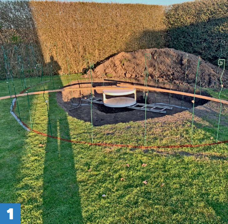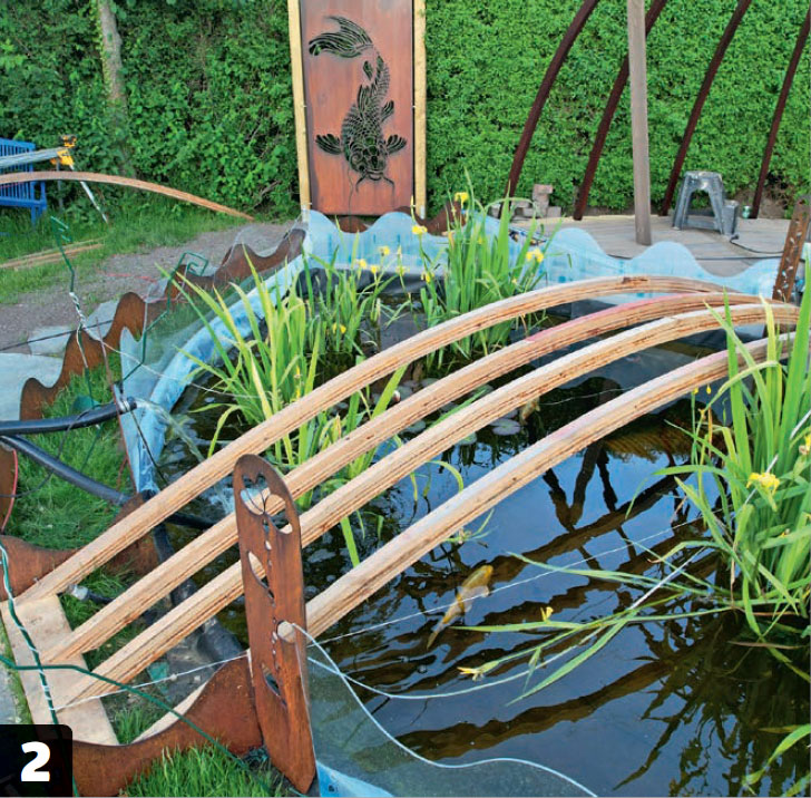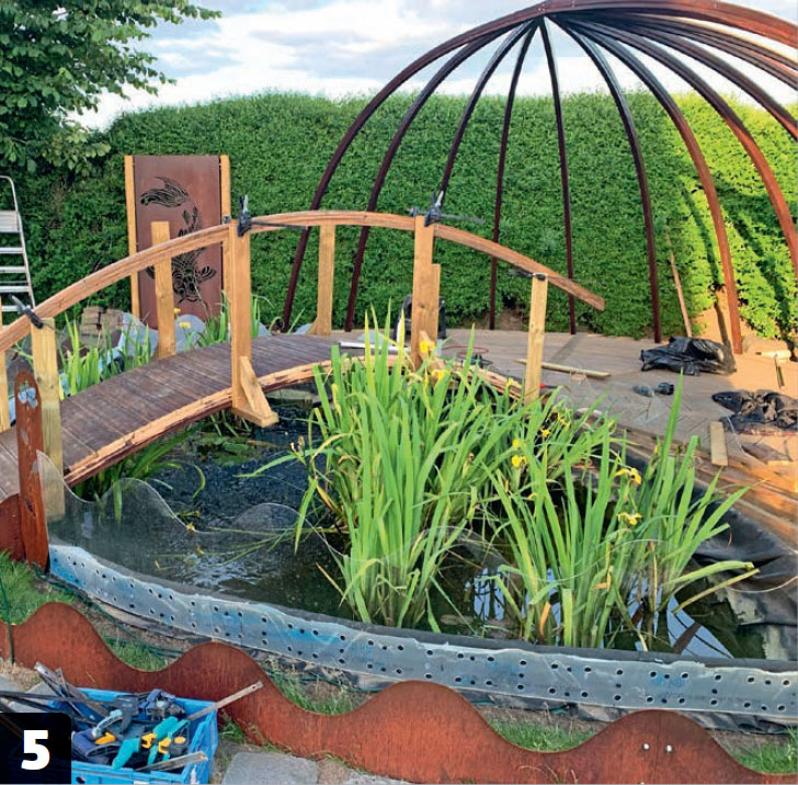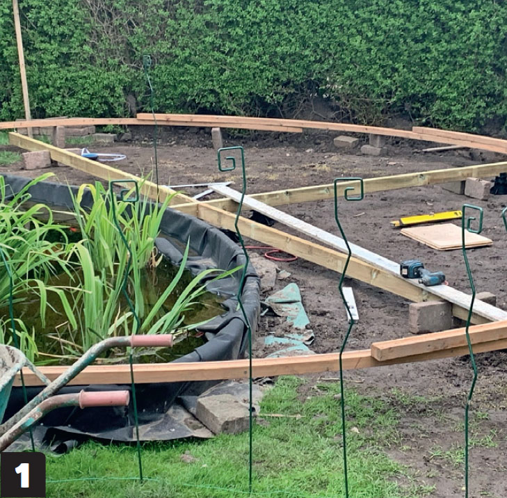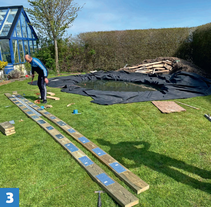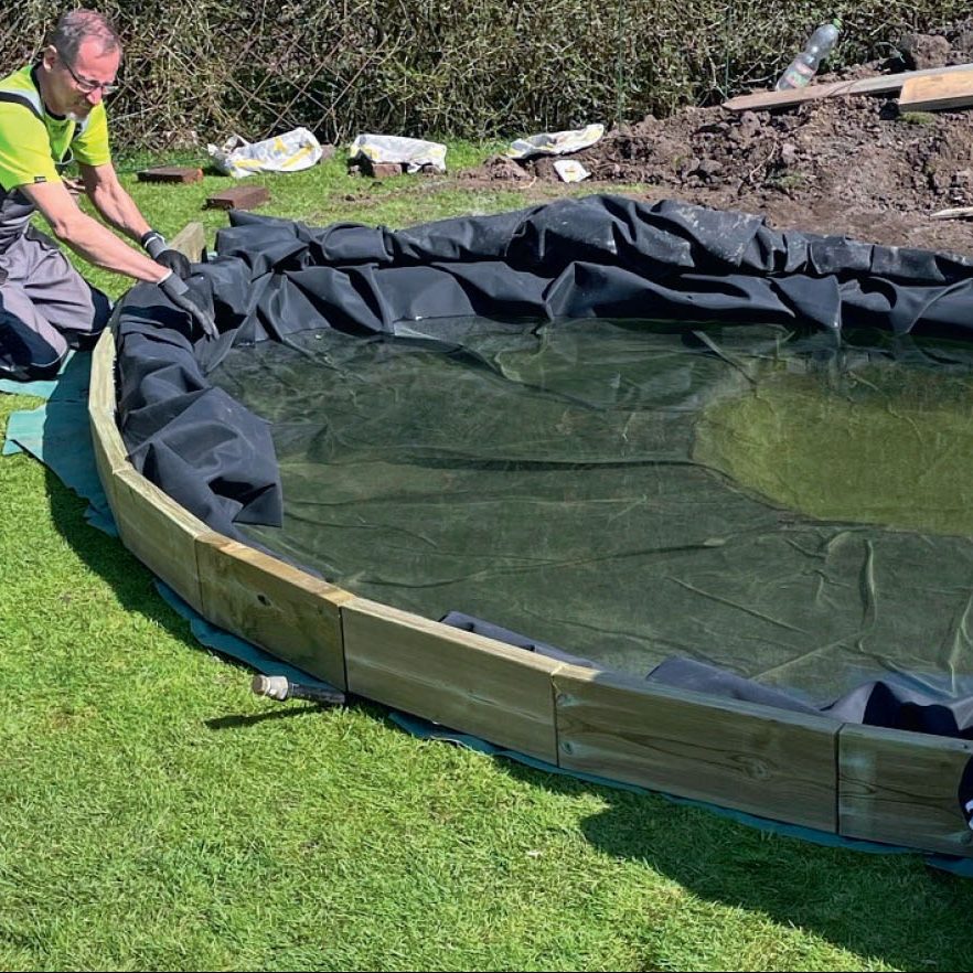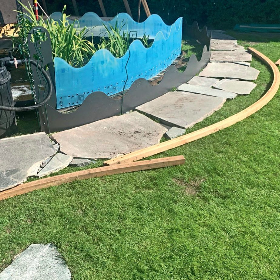 Duken viks om en kant, som här är gjord av tryckimpregnerade reglar som kapas i 50 cm långa bitar och som skruvas ihop med spikbeslag, så att de kan böjas och formas efter dammen.