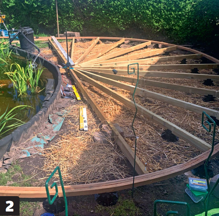 Bjälkarna fördelas så att det max är 60 cm mellan dem längs syllen. I cirkelns mitt sågas de i vinkel och monteras mot varandra. Hela mitten understödjs av en stor stenplatta. Syllen stöttas också upp genom att lägga stenplattor undertill.
