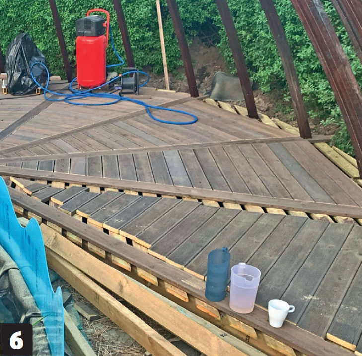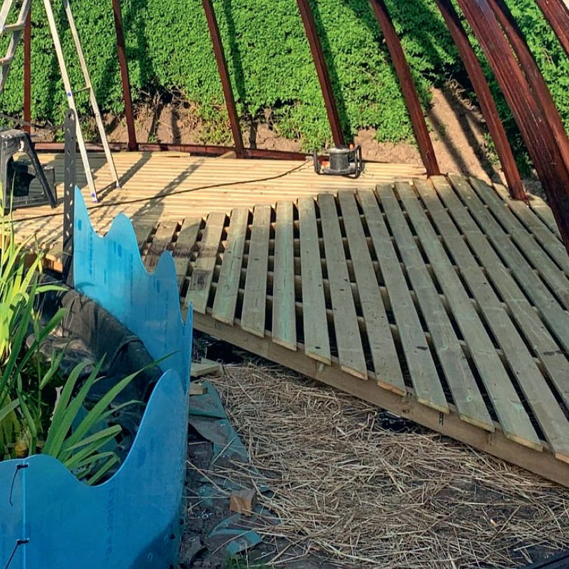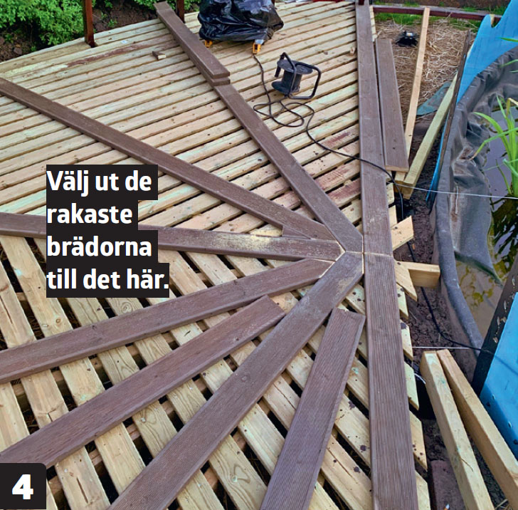 Det slutliga trädäcket skruvas fast på ett underlag av tryckimpregnerade brädor.
