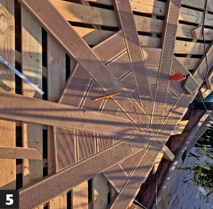 Dela in trädäcket i sex fält med sju brädor, som följer bjälklagets riktning. Brädorna möts i vinkel i mitten.