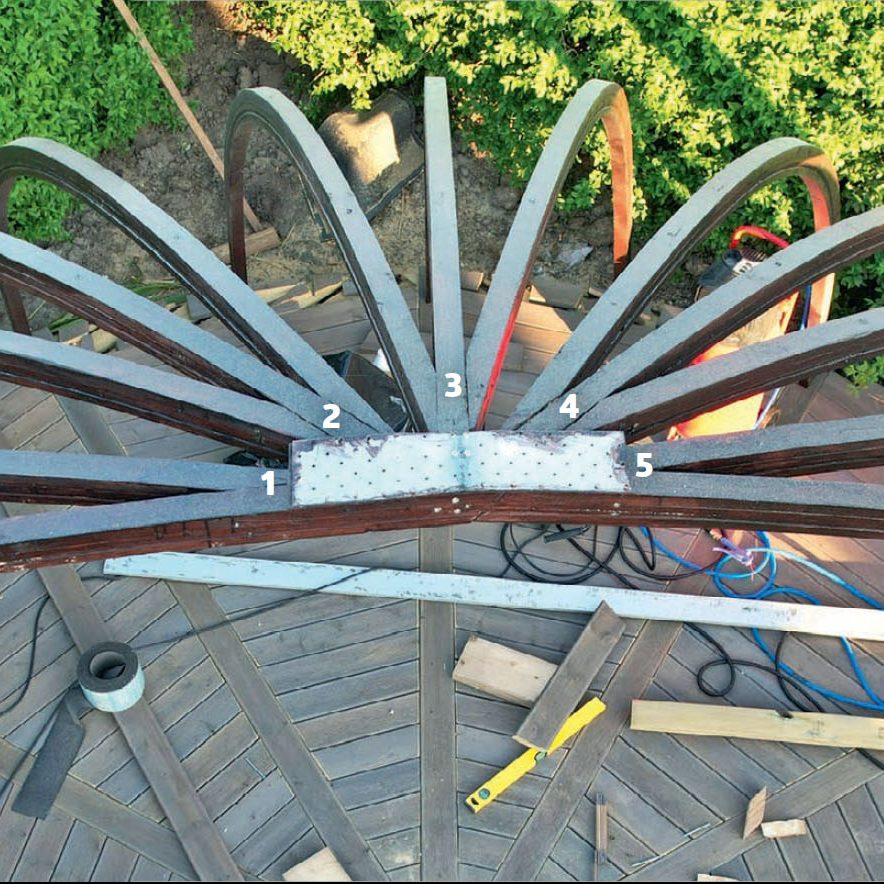 Halvcirkeln bildas genom att sätta en golvbjälke tvärs över alltihop. Därefter delas halvcirkeln i två lika stora delar genom att sätta en bjälke vinkelrätt mot den första. De övriga golvbjälkarna fördelas därefter med lika stora avstånd.