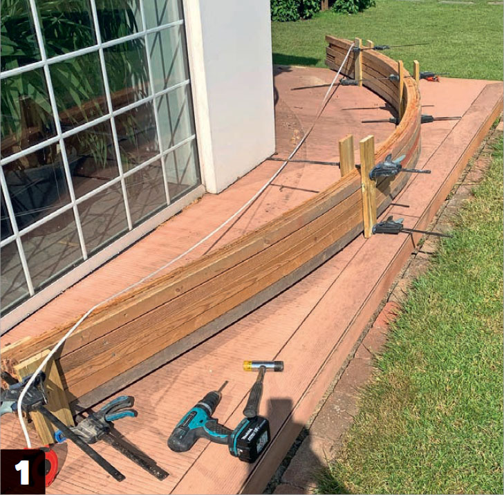 Gör en vikkant av 45 x 145 mm reglar. Bitarna på ca 50 cm skruvas ihop med hålplattor. Det gör det möjligt att skapa en mjuk böjning av det kraftiga virket.