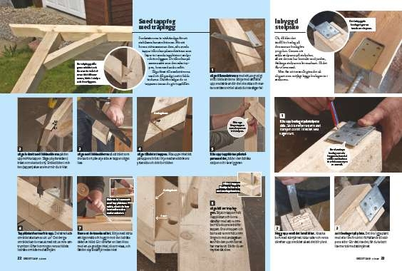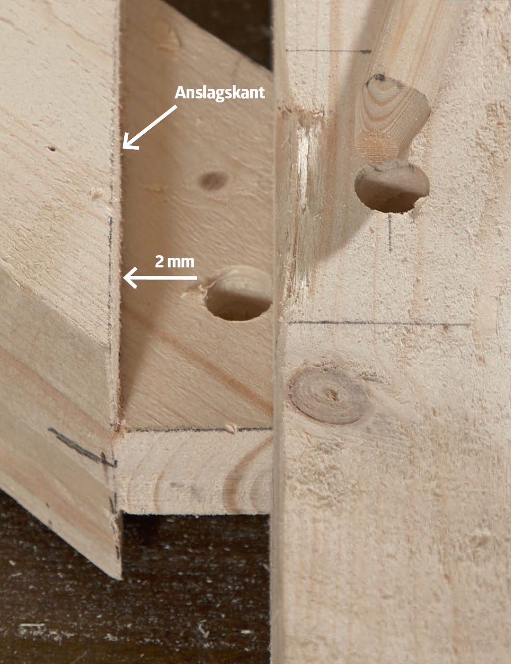 Såga först till snedsträvorna med ett 45-gradigt snitt i båda ändarna. Därefter sågar du ut tapparna innan du gör tapphålet.