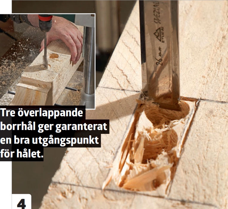 Ta bort träet med stämjärnet när borret inte når längre. Borra därefter igen och ta bort träet tills borret har borrat helt igenom.