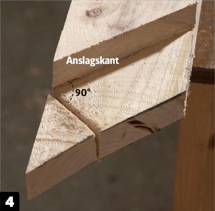 Såga till sist ut tappen. Rita upp vinkelrätt på tappens bröst i linje med snedsträvans yttersida och skär bort biten.