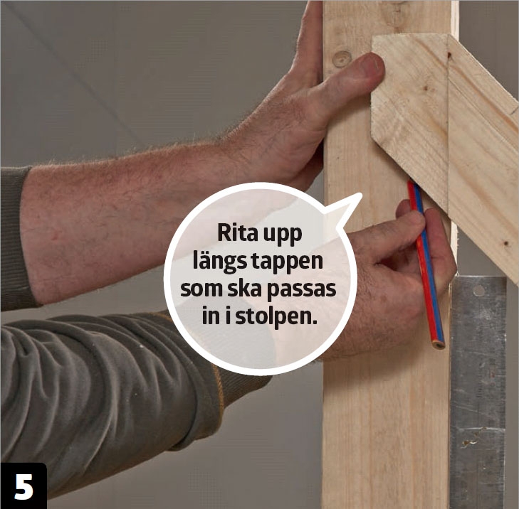 Rita upp efter en mall. Mallen kan t.ex. göras av masonit eller papp och förses med en list, så som visas, så att den kan läggas vinkelrätt på stolpen.