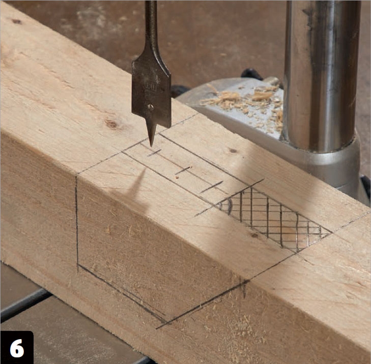 Tappkistan har märkts upp. Det streckade området ska karvas ut i 45°. Det övriga området kan borras ut med ett 28 mm-centrumborr. Efter borrningen rensas hålets lodräta område med stämjärn.