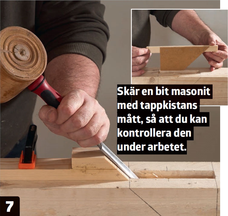 Karva ut det sneda fältet. Börja med att ta ett ögonmått och hugg in mot den lodräta delen av hålet. Gör därefter en liten kloss med en 45-gradig vinkel, så som visas, och låt den styra stämjärnets vinkel.