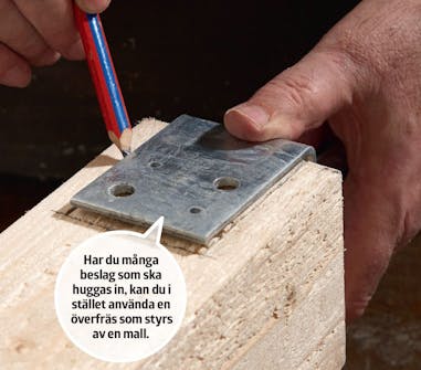 Rita upp beslaget på stolpens sida. Stick därefter ned ett vasst stämjärn lodrätt i strecket hela vägen runt.