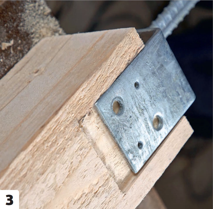 Skruva fast en bräda (19 x 100 mm) på stolpens sida. Brädan hjälper till att stötta hålsågen som du därefter ska använda till att såga en rund form i stolpen med.