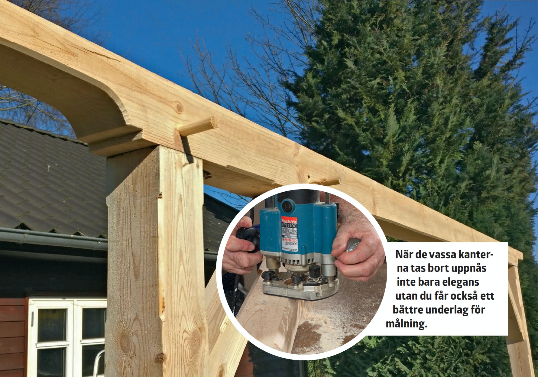 Det är alltid en bra idé att fasa av (alltså runda) stolparnas kanter 1-2 mm. På så sätt tar du bort den vassa kanten som träskyddet inte fäster på och som ofta innehåller obehagliga flisor.