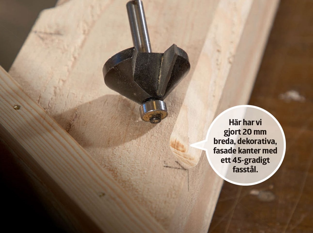 Sätt i ett 45-gradigt fasstål i överfräsen. Sänk ned stålet så att det träffar stolpens kant. Därefter är det bara att leda överfrä-sen längs kanten på det avsnitt som du vill fasa av.