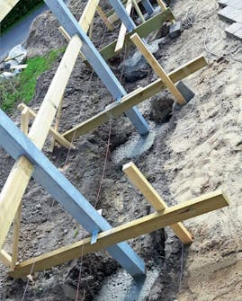 Det här planket är 28 m långt och totalt 17 stolpar ska gjutas fast i betong. Stolparna stöttas tillfälligt i en vecka tills betongen är torr och klädselbrädorna kan sättas upp.