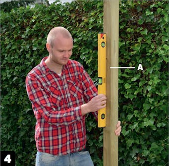 Sätt stolparna (A) i lod och packa samtidigt plintbetongen med ett avlångt föremål, t.ex. en 45 x 45 mm regel. När stolparna är fixerade i betongblandningen och i lod, vattna betongen tills den är fuktig men inte blöt.