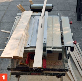 Såga först till ribbor (E) och tvärslåar (D). De tillverkas av 20 x 95 mm brädor som delas 2 respektive 3 gånger på längden med en bordscirkelsåg. Du kan köpa ribborna färdiga, men då kan det bli lite dyrare.