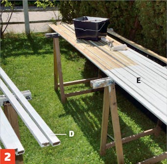 Måla ribbor (E) och tvärsåar (D). De ska strykas med ett heltäckande träskydd i en kulör som du väljer själv. Här väljer vi vitt eftersom vi inte vill att staketet ska dra till sig för mycket uppmärksamhet.