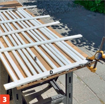 Lägg ribborna (E) på en bänkskiva och lägg tvärslåarna (D) ovanpå. Tvärslåarna uppe och nere ska vara i jämnhöjd med änden på ribborna. Fäst sedan den nedre tvärslån i bordet och ribborna med en tving.