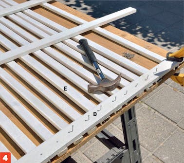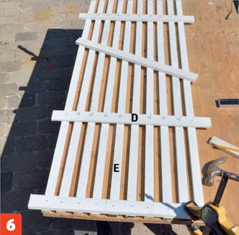 Spika fast den första tvärslån (D) i ribborna (E). Börja från mitten genom att placera en ribba så att den korsar tvärslån exakt på mitten. Spika fast tvärslån med 1,8 x 40 mm spik. De övriga ribbsorna ska sitta med ca 2,38 cm mellanrum och spikas fast.