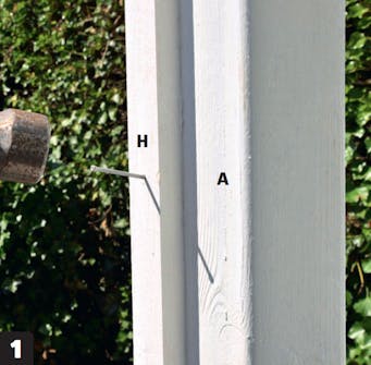 Spika fast monteringslister (H) på stolparna (A). Monteringslisterna ska sitta ca 8 cm från toppen på stolparna. Listerna ska flukta med stolparnas bakkant, dvs den som syns på insidan.