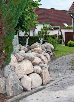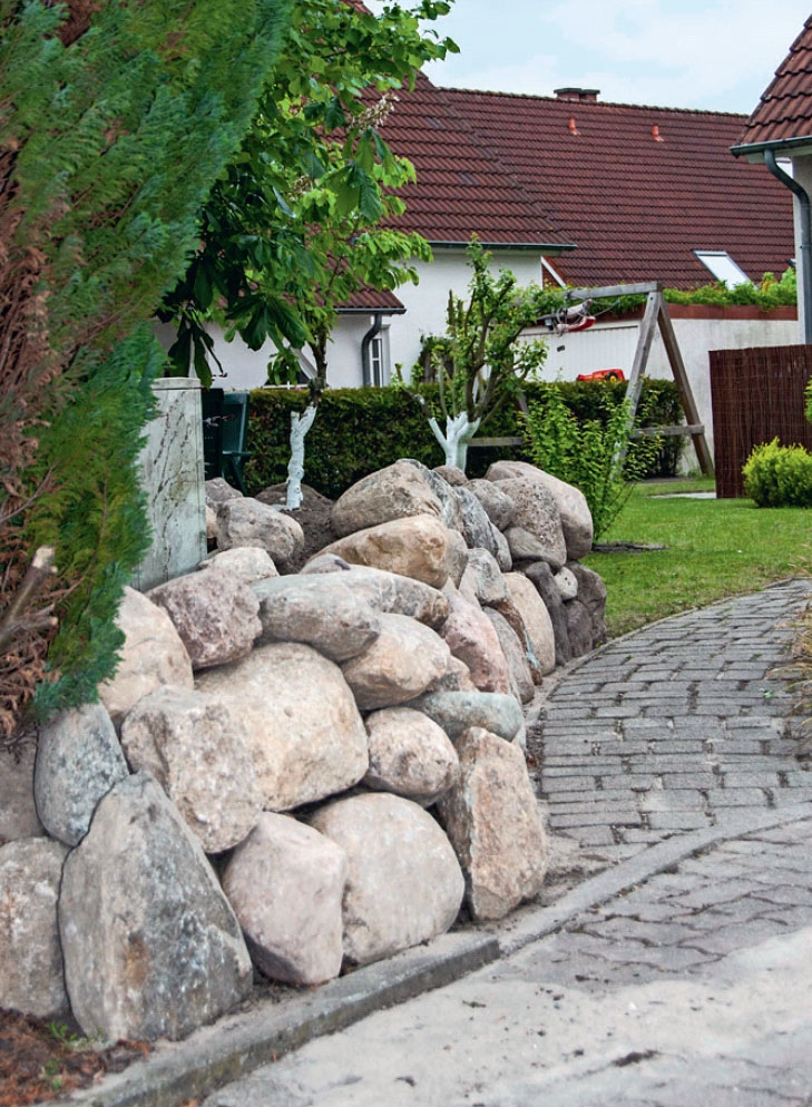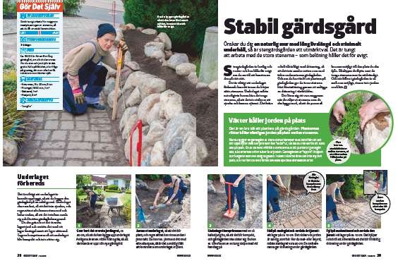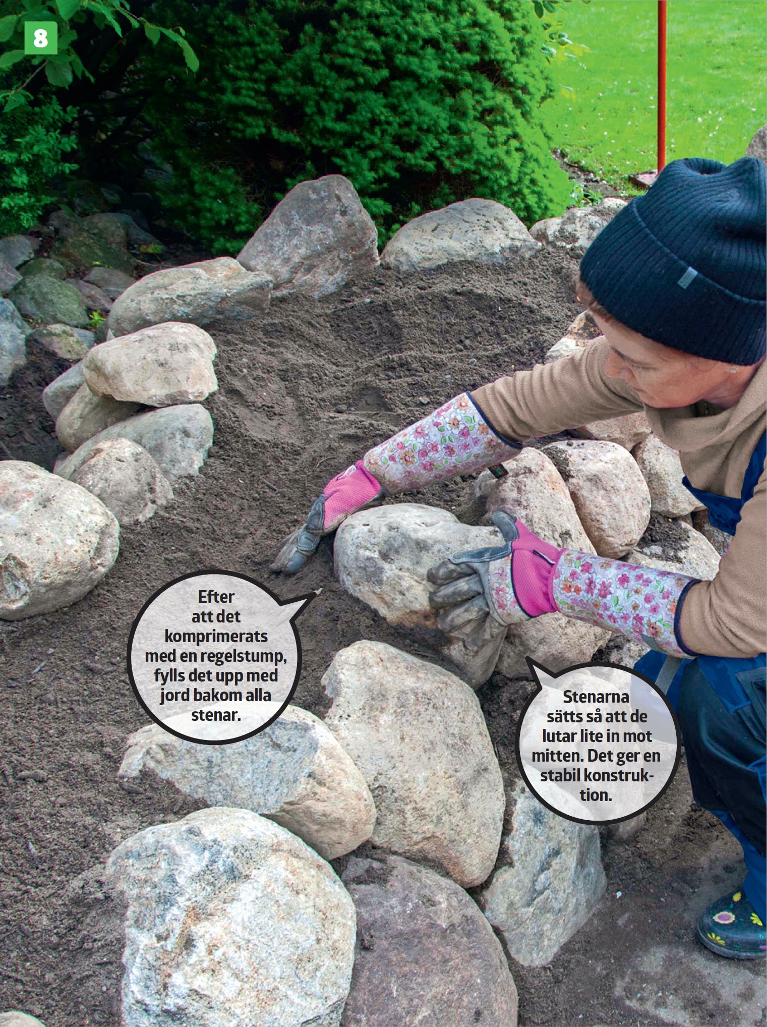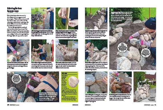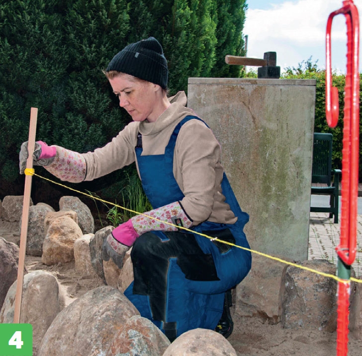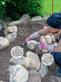Det är tungt arbete. Var noggrann med placeringen av stenarna, så att du får en stabil konstruktion.